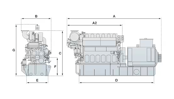 | Modèle de moteur | kWe | A | A2 | B | C | D | E | F | G | Poids à sec |