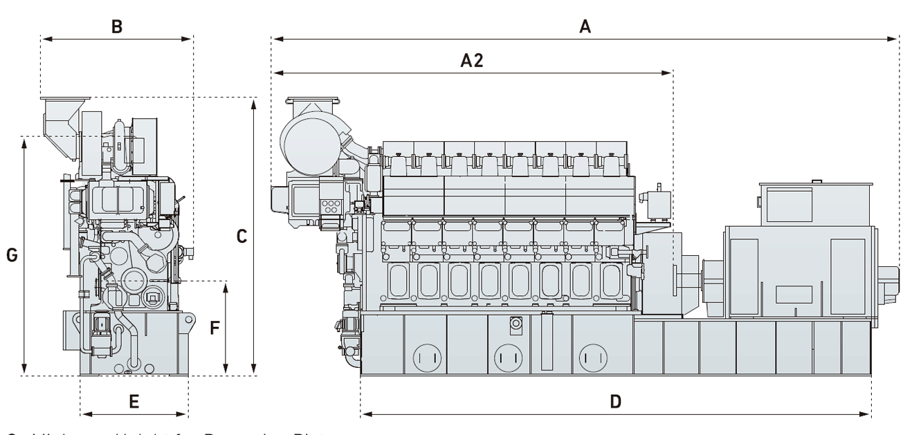 | Modèle de moteur | kWe | A | A2 | B | C | D | E | F | G | Poids à sec |