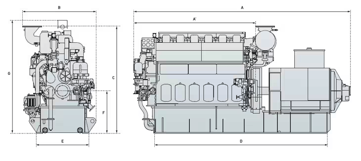 | Motormodell | kWe | A | A2 | B | C | D | E | F | G | Tørrvekt |