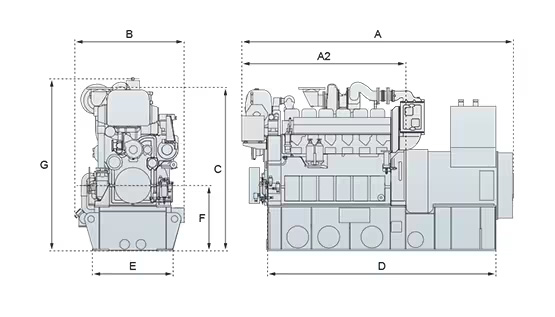 | Motormodell | kWe | A | A2 | B | C | D | E | F | G | Tørrvekt |